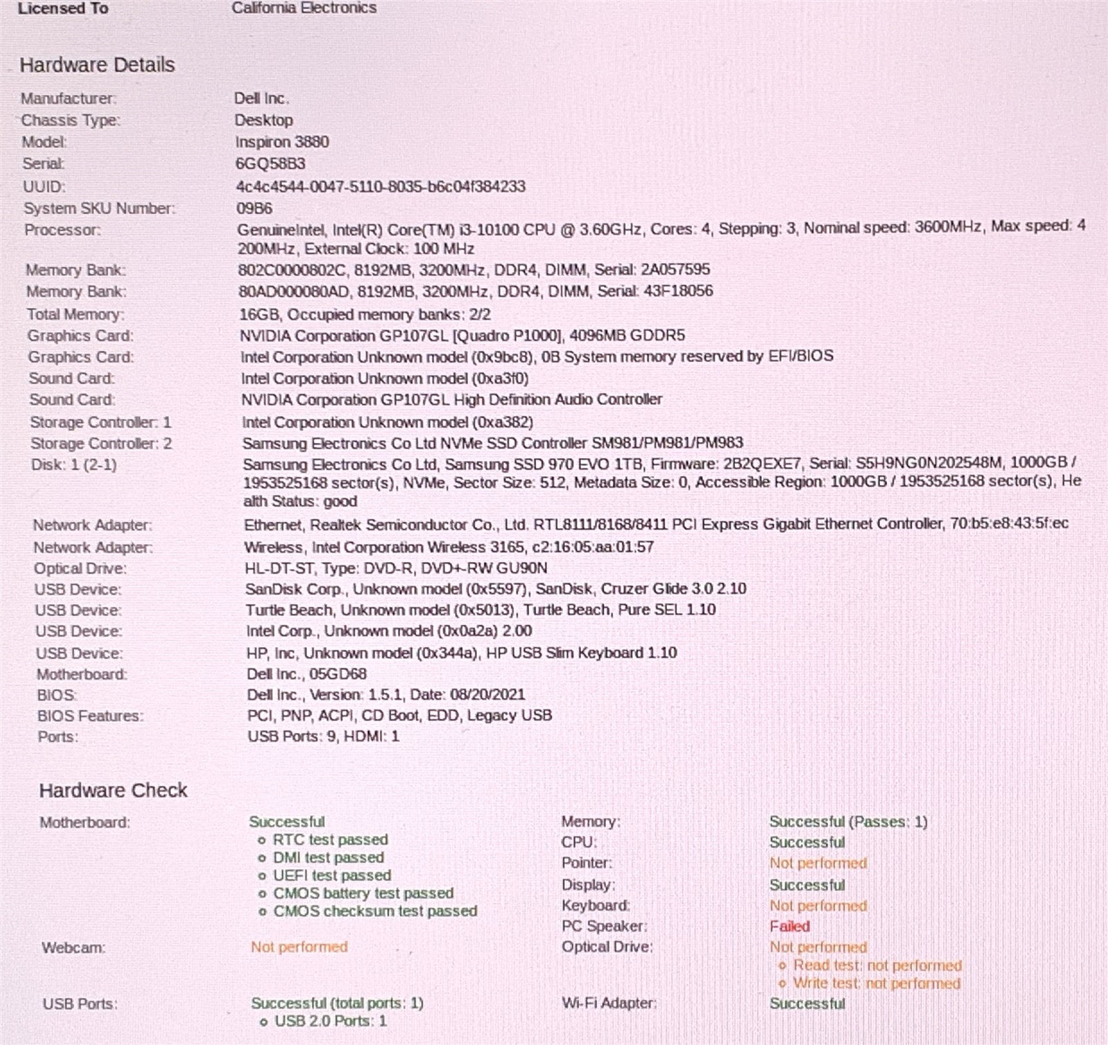 • (1) – DELL INSPIRON 3880 MT CORE I3-10100 3.60GHZ 16GB 1TB NVME WIN11P 25H2 WIFI P1000