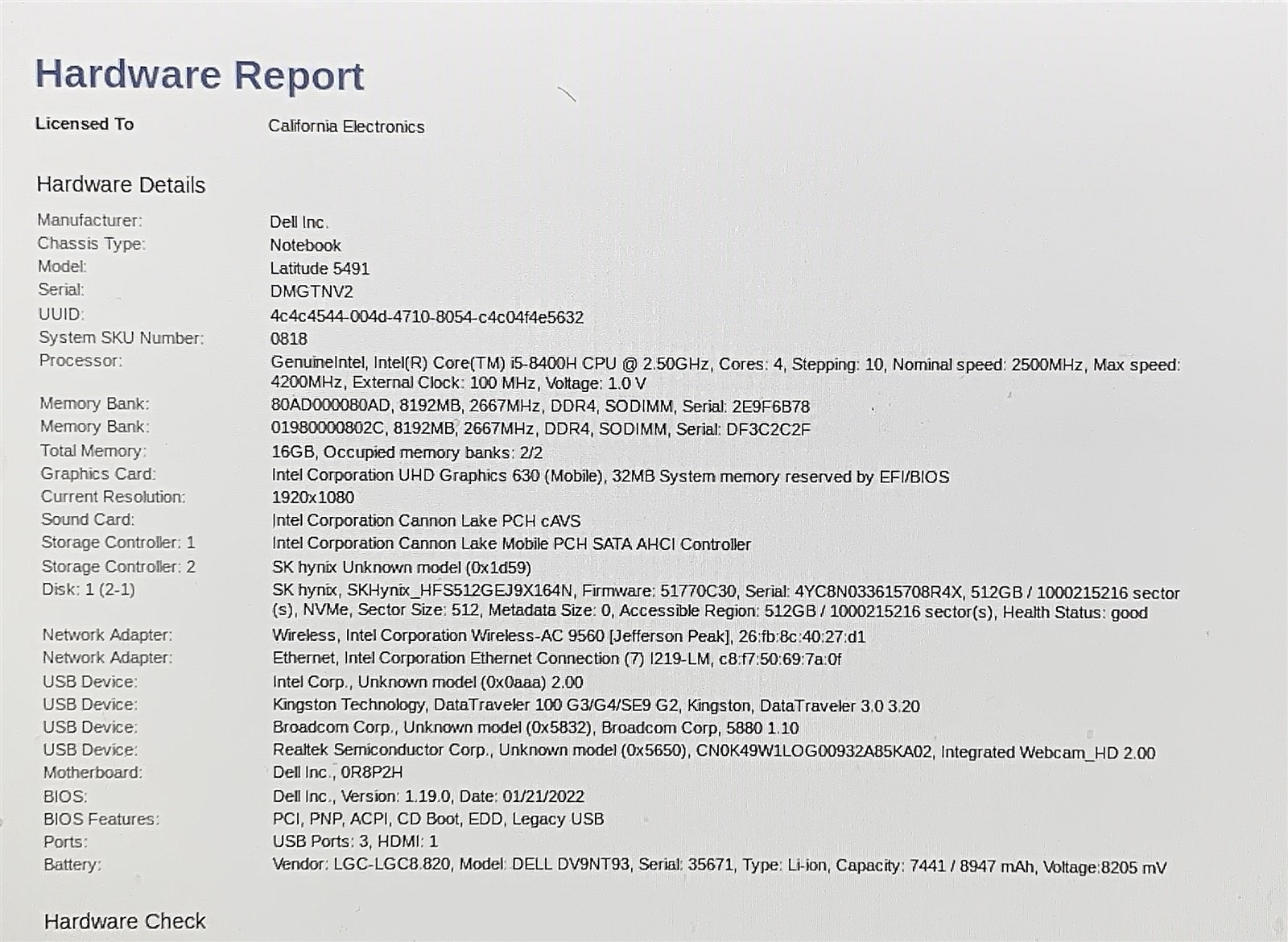 • (1) – DELL LATITUDE 5491 LAPTOP I5 8400H 2.50GHZ 14″ FHD 16GB 512GB NVME WINDOWS 11