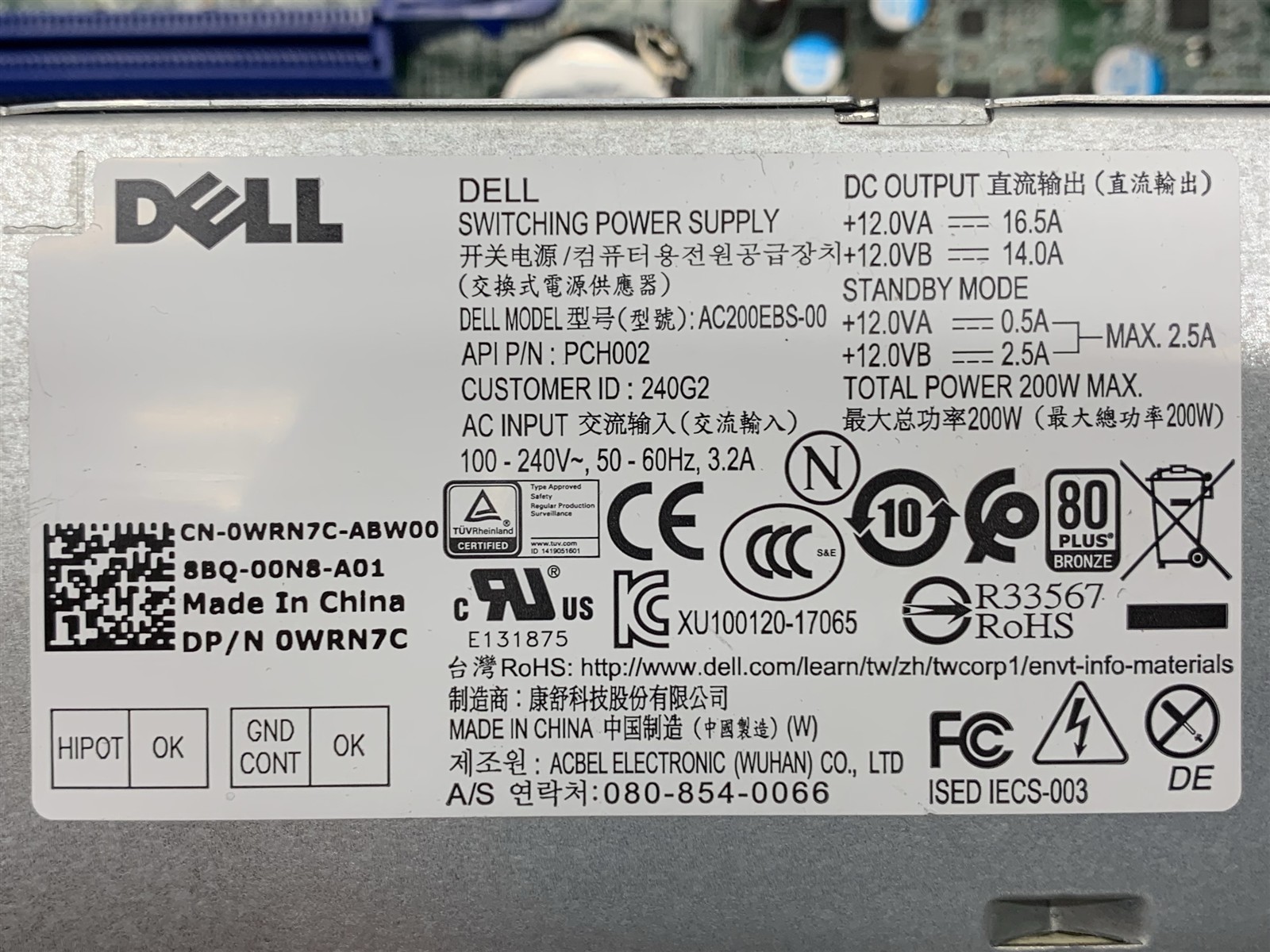 • (1) – 200W DELL POWER SUPPLY 80+ BRONZE 0WRN7C
