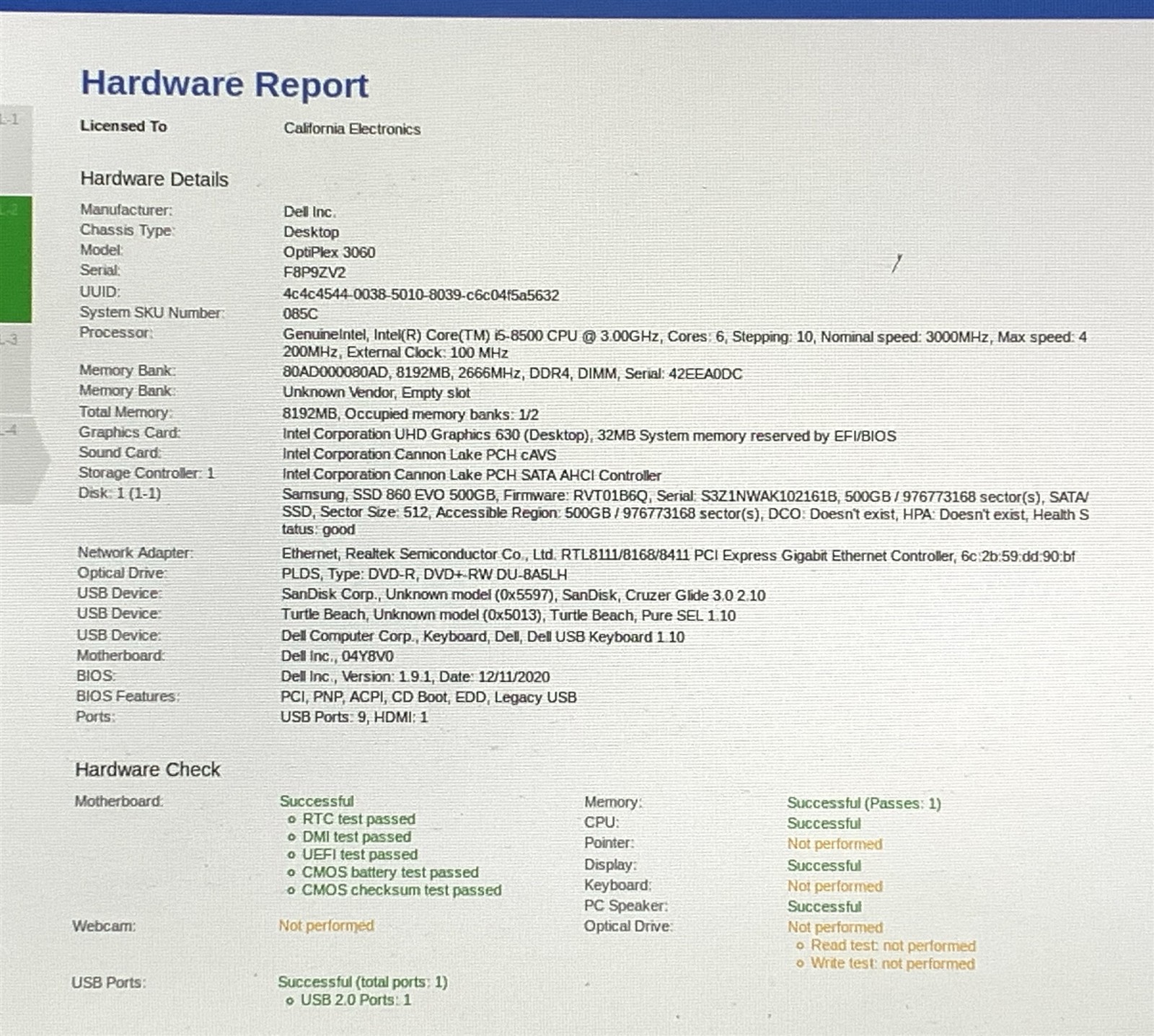 • (1) – DELL OPTIPLEX 3060 SFF I5-8500 3GHZ 8GB DDR4 PC4-2666V 500GB SSD WIN11P 25H2 PC