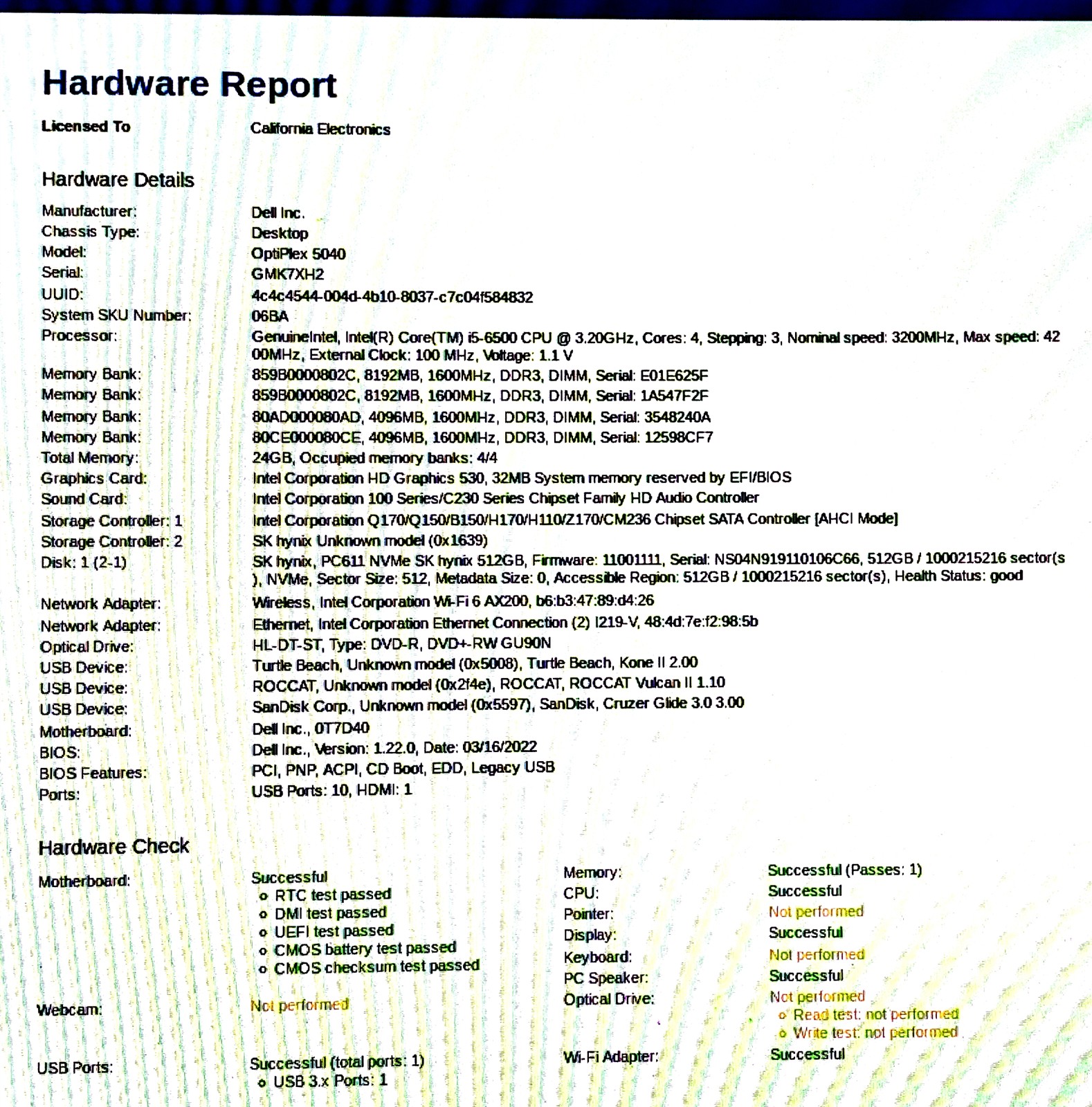 • (1) – DELL OPTIPLEX 5040 SFF CORE I5-6500 3.20GHZ 24GB DDR4 512GB NVME WIN10P WIFI PC
