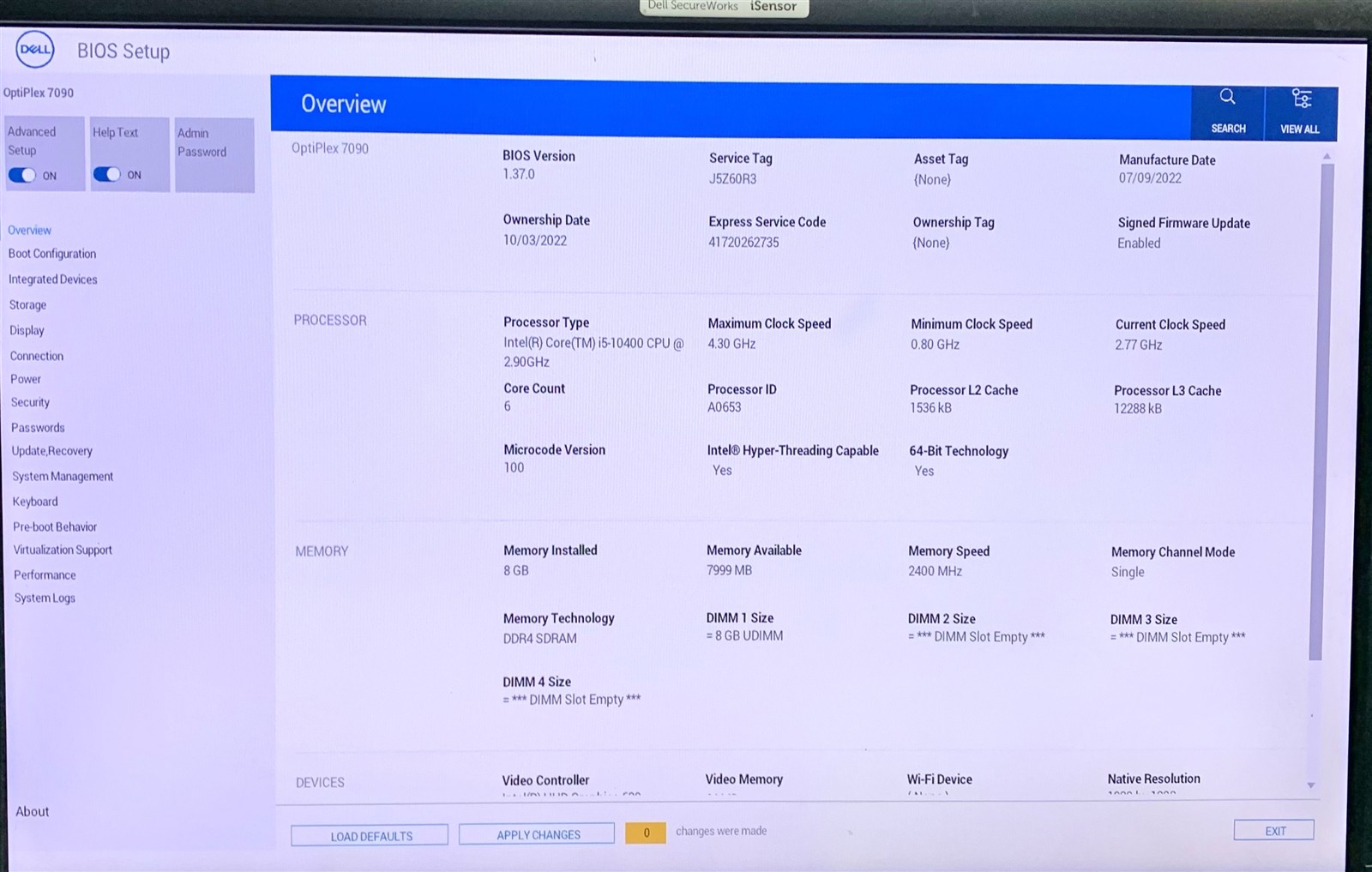 Dell OptiPlex 7090 SFF Desktop i5-10400 2.9GHz 8GB RAM 275GB SSD Win11 Pro 25H2