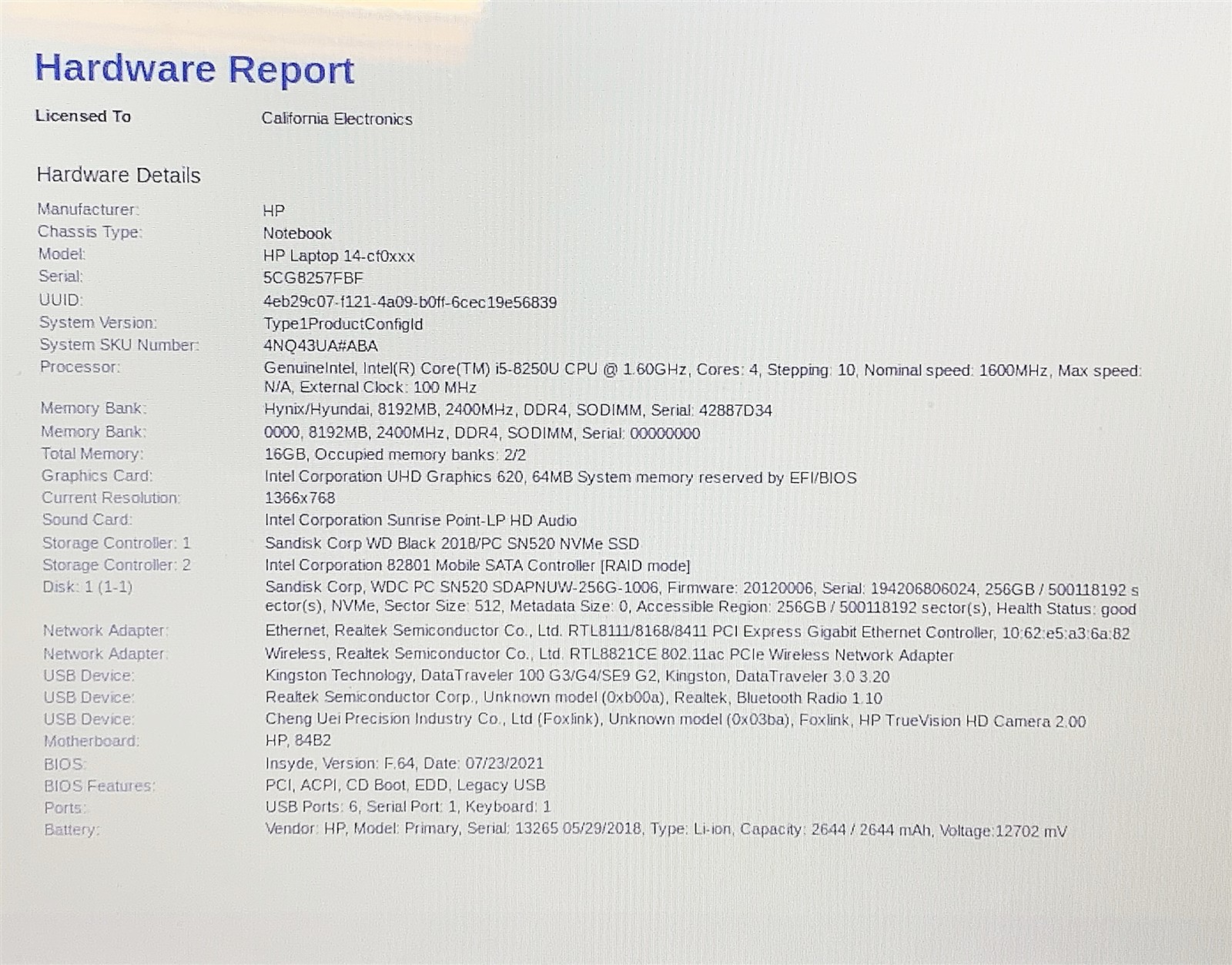 This unit powers on, POSTs, and boots into an operating system (Windows 11). The OS is a fresh install on a wiped drive. Please note we have only installed Windows 11 onto the system, the buyer will be responsible for going through the Windows setup and updating/driver installation process. Battery held a charge during testing, current health and remaining life is unknown and not guaranteed. Please note, there are some scuffing on the lid and back cover. See last couple of pictures for reference. This unit has cosmetic blemishes/scratches on top, bottom and sides. Screen resolution 1366×768.[/n]