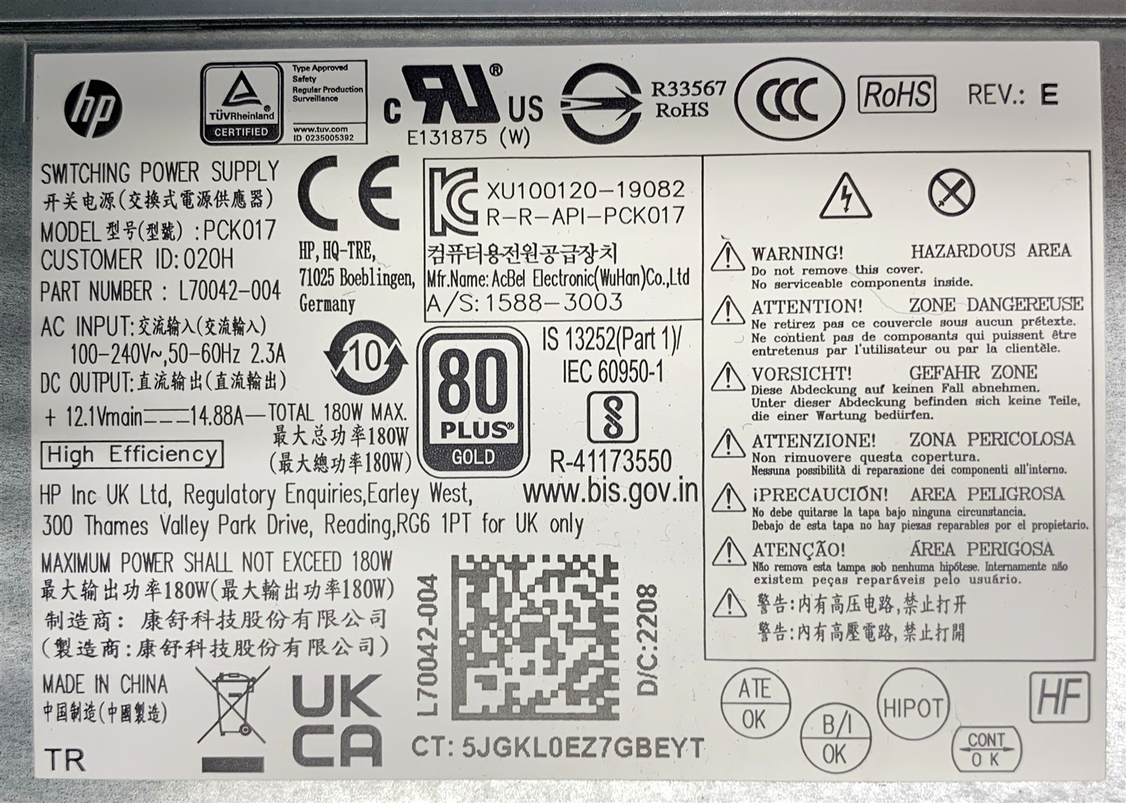 • (1) – 180W HP POWER SUPPLY L70042-002 80+ GOLD