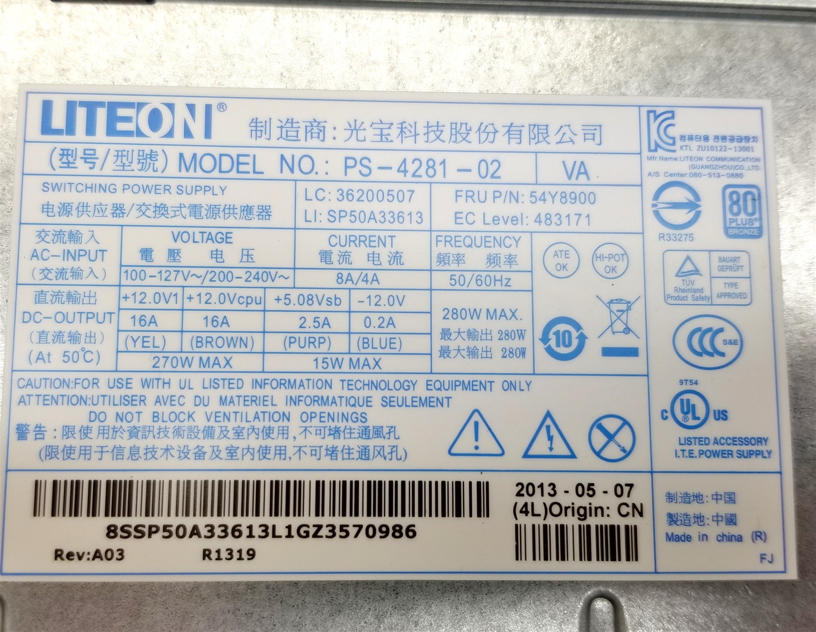 • (1) – 270W LITEON POWER SUPPLY PS-4281-02 80+ BRONZE