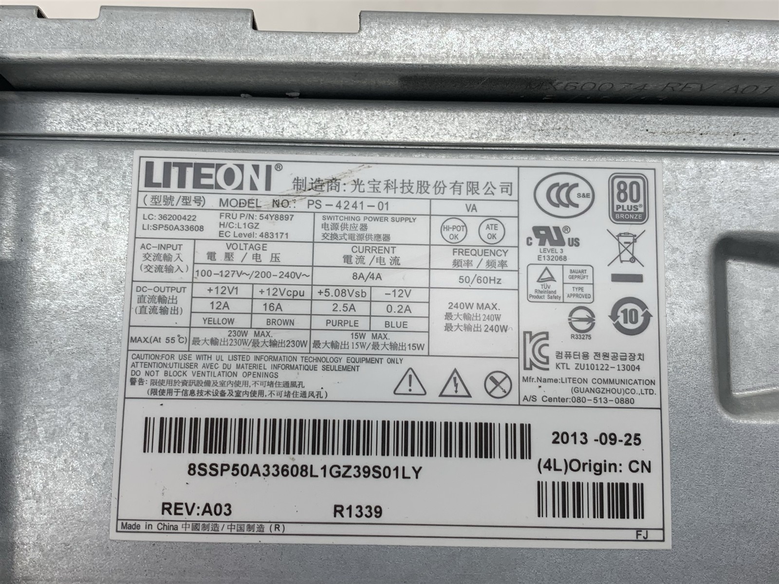 • (1) – 240W LENOVO LITEON POWER SUPPLY PS-4241-01 80+ BRONZE
