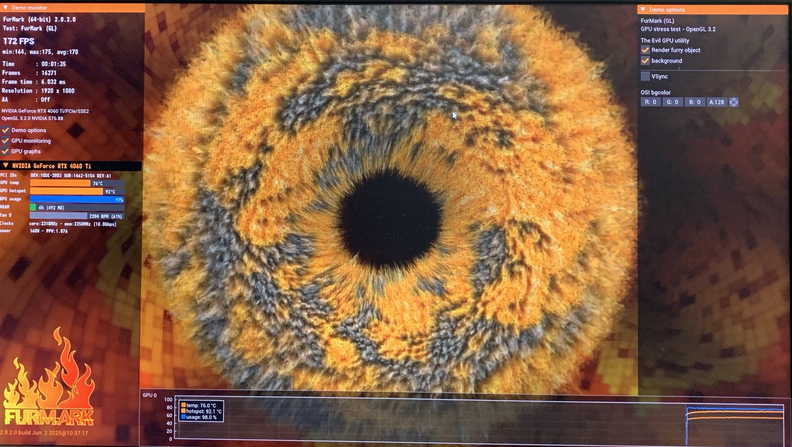 The unit has been rigorously stress-tested and bench-marked using Unigine Heaven Benchmark 4.0 and Furmark to evaluate both performance and thermal stability. Under Unigines demanding extreme settings with Ultra Quality enabled and rendered through Direct3D11, the system achieved an average of 159.5 frames per second, securing a performance score of 4018. When pushed through Furmarks intensive full-HD (FHD) stress test, the unit maintained an output of 172 FPS, delivering a total of 16,271 frames while sustaining an average operating temperature of 76.0C, demonstrating solid thermal management under heavy loads. Additionally, the hardware is equipped with 3 Display-Port outputs, and 1 HDMI port offering versatile multi-monitor connectivity.