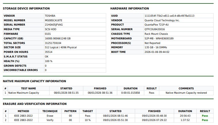 This drive is used but in excellent working order with a 100% health score according to SMART diagnostics. It has been sanitized using the IEEE 2883-2022 Clear method, ensuring zero recoverable data while preserving full drive functionality. No bad sectors were found during testing, and the drive is ready for immediate use. Wipe certificate in photos is representative of the unit in the picture. Your serial number may vary.