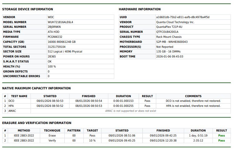 This drive is used but in excellent working order with a 100% health score according to SMART diagnostics. It has been sanitized using the IEEE 2883-2022 Clear method, ensuring zero recoverable data while preserving full drive functionality. No bad sectors were found during testing, and the drive is ready for immediate use. Wipe certificate in photos is representative of the unit in the picture. Your serial number may vary.